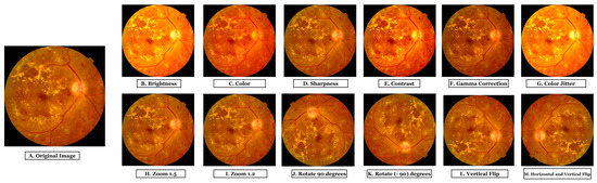 Data augmentation can help to balance a dataset. After reducing the two majority class images, we employed a data augmentation method to create a balanced dataset in this study. Data augmentation is also a fundamental practice for avoiding overfitting problems [30]. Increasing the amount of data should create samples similar to actual images and ensure the dataset is balanced. Another issue is maintaining high image quality, which is especially important in the medical field [31]. In this work, we have employed 12 types of augmentation techniques to enhance the dataset. These techniques included two types of zooming (with factors of 1.2 and 1.5), two types of flipping (vertical and horizontal plus vertical), rotations of 90 degrees and −90 degrees, and adjustments to the brightness, sharpness, contrast, and color, as well as color jittering and gamma correction. We used these augmentation techniques to generate a large data hub of quality fundus images.