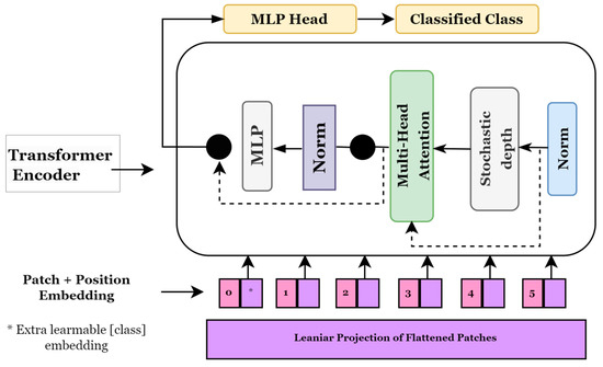 Transformer models, which are widely used in natural language processing, pay attention to image patches and sequences. In this instance, a series of image patches serves as the input to the transformer block, which employs the multi-head attention layer as a self-attention mechanism. Generally, the transformer blocks provide a tensor of batch size, several patches, and projection dimensions, which can be supplied to the classifier head using Softmax to compute the class probabilities [36]. Alexey et al. [37] proposed a novel method for applying transformers to visual data and presented vision transformers (ViTs) for image categorization. Figure 5 depicts a general approach used in ViT models. It shows how an image is transformed into a group of patches, each indicating a location of a portion in the image. This approach allows us to consider an image as sequential data and use transformers originally designed for NLP. To ensure consistency in protection dimensions, these image patches are flattened before they are fed into a trainable linear projection layer. Since the ViT model is utterly indifferent to the hierarchy of the input image, position embedding is included in these projections. The transformer encoder block takes these patches, their positions, and an additional classification token, called the CLS token. To learn different types of self-attention, the transformer encoder has layers that may split their focus among seven different heads. A multi-layer perceptron (MLP) receives a combined set of results from all existing nodes.