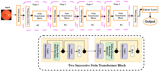 Another sophisticated computer vision tool is the Swin transformer, which is a modified version of the ViT. It uses hierarchical feature maps and scales computationally with image size. It generally builds a hierarchical representation by starting with small-sized patches and gradually integrating nearby patches in deeper transformer layers. It can use feature pyramid networks (FPN) [38] or U-Net [39] for dense prediction with these hierarchical feature maps. Since the number of patches is fixed in this method, the patch size and the complexity scale linearly with the image size. Unlike previous transformer-based systems [37], which produce a single-resolution feature map and have quadratic complexity, the Swin transformer has properties that make it suitable as a general-purpose backbone for many vision tasks. Figure 6 shows the architecture of the Swin transformer. It can be seen from Figure 6 that the Swin transformer consists of four different building blocks. First, a patch partition layer will segment the input image into several patches. The patches are then sent to the Swin transformer block, which is a part of the linear embedding layer. The basic architecture is structured into four stages: linear embedding layers and transformer blocks. The Swin transformer is built based on a modified self-attention and a block that comprises multi-head self-attention (MSA), layer normalization (LN), and a 2-layer multi-layer perception (MLP) [36]. We employed the Swin transformer in this study to solve the classification problem and diagnose retinal diseases.