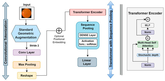 Here, the convolutional layer (Conv2D) contains 64 filters with a stride of 2 and the ReLU activation function. The maxpool layer then scales down the generated Conv2D feature maps. The convolutional tokenization block accepts images of any dimension as input. Consequently, the CCT models do not need all the image patches to be of the same size. These convolutional patches in the CNN layers aid in the model’s ability to store local spatial information. The image patches made by the first block are sent to the transformer-based backbone, where an encoder block is made up of a multi-head self-attention (MSA) layer and a multilayer perception (MLP) head. The transformer encoder uses layer normalization (LN), the GELU activation function, and dropout. In CCT models, layer normalization comes after positional embedding, where the positional embedding is learnable.