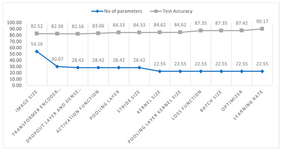 Figure 9 displays the configuration of our proposed model architecture. Figure 9 depicts the increase in test accuracy and the decrease in the number of parameters. Initially, the parameters were 541,638 with a test accuracy of 82.52%. After completing the ablation study, the accuracy increased by 7.65% (90.17%), and the number of parameters of the model decreased by 316,160.