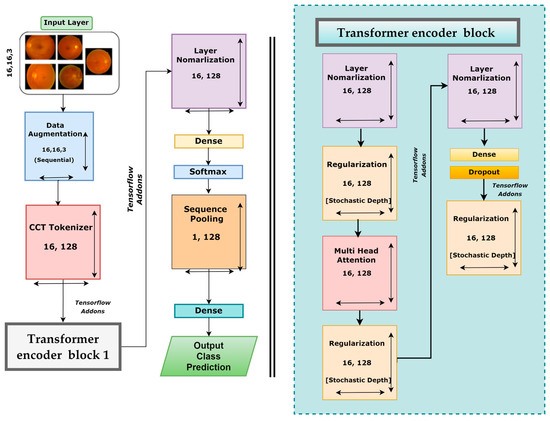After performing ablation studies on the base CTT model, a new CTT model, named DR-CCTNet, was proposed. DR-CCTNet architecture is constructed to minimize computational complexity and training time while optimizing performance. The DR-CCTNet model resembles the original CCT model with fewer transformer encoder components and some layer changes. Figure 10 depicts the DR-CCTNet model architecture. The base or the standard CTT model has two transformer encoder blocks, whereas the DR-CCTNet model has only one transformer encoder block, resulting in a smaller model with a faster training time. Otherwise, the model architecture is similar but with several changes in model hyperparameters, such as the stride and kernel sizes. After ablation, the kernel and the stride size were replaced with 3 and 1, respectively. In the base CTT model, there were two pairs of dense and dropout layers, while in the DR-CCTNet, one pair of dense and dropout layers was eliminated. Moreover, the CCT tokenizer output was replaced with a 16 × 128 dimension. In contrast to transfer-based models, the model does not need positional encoding. This contributes to its low computational complexity. Self-attention has an O(m2.d) computational complexity, where m denotes the length of the input sequence, and d represents the dimensionality of the vector representation. Adding positional encoding raises the computational complexity to (O(m2.d + m.d2)) [35]. Since positional encoding is not required in the DR-CCTNet model and the transformer backbone is completely based on the self-attention system, the training and testing phases of the proposed model require fewer resources and are faster. This improves the model’s efficiency.