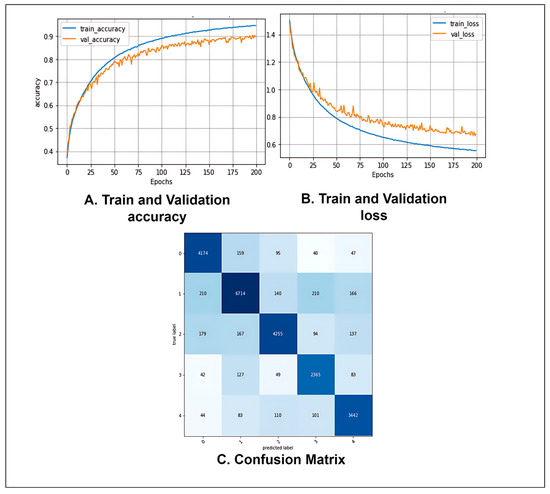Figure 11 shows the accuracy and loss curves of the proposed model. The training and validation curves converge efficiently with no significant gaps between them, indicating no overfitting during the model’s training phase (Figure 11A). Similarly, the loss curves in Figure 11B demonstrate consistent convergence. It may be inferred that no overfitting or underfitting occurred throughout the model’s training phase. Figure 11C depicts the proposed model’s confusion matrix. The row values denote the actual labels of the test images, while the column values indicate the labels predicted by the model. The diagonal values of the confusion matrix show the number of correctly predicted test images. It can be seen that the model is not biased toward one or more classes and does not predict any one class much better than the others. In fact, the model provides almost a similar number of correct predictions for each class.