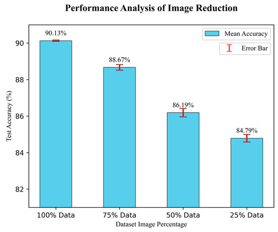 This study has followed an image reduction strategy to test the robustness of the proposed DR-CCTNet model’s performance. The number of input images gradually decreased, and the DR-CCTNet model was tested multiple times to observe the accuracy and an error bar to visualize the gaps between the actual and estimated results. The number of images was reduced by 25% of the original size for each step. Additionally, we performed three times on randomly selected images to test the model’s performance in each test case. Figure 12 depicts the error bars with the mean value of model accuracy three times the test case. In contrast, the ± value indicates the difference between the maximum accuracy (in triplicate performance) and their mean value. The results are depicted in Figure 12.