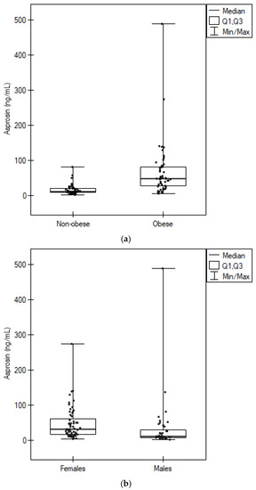 Figure 1 shows the levels of serum asprosin divided by sex and the presence of obesity.