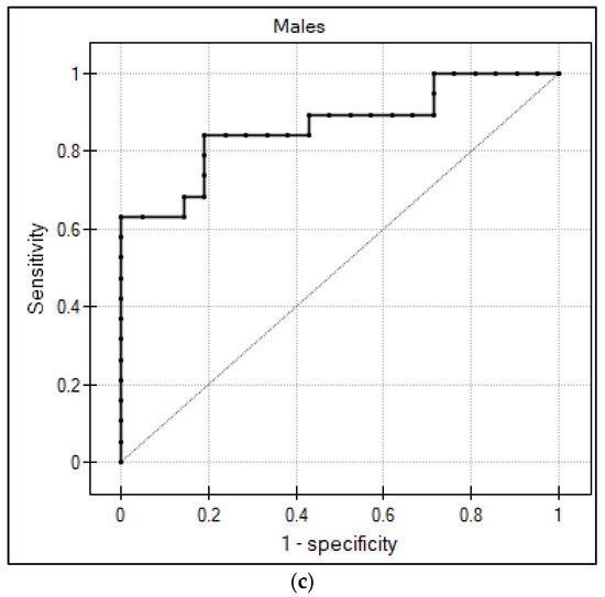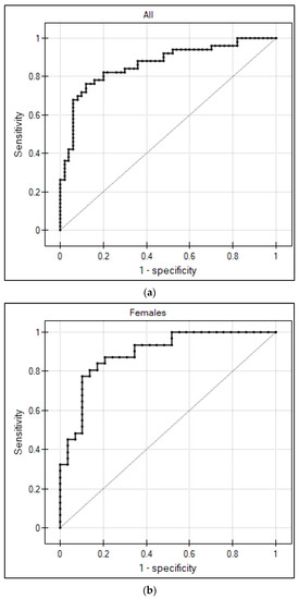 The area under the ROC curve of asprosin for predicting the presence of obesity, 95% confidence intervals, optimal cut-off points, corresponding sensitivities, and specificities for the whole group and both sexes are shown in Table 6. Figure 2 presents the receiver operating curves of asprosin concentrations for detecting obesity.