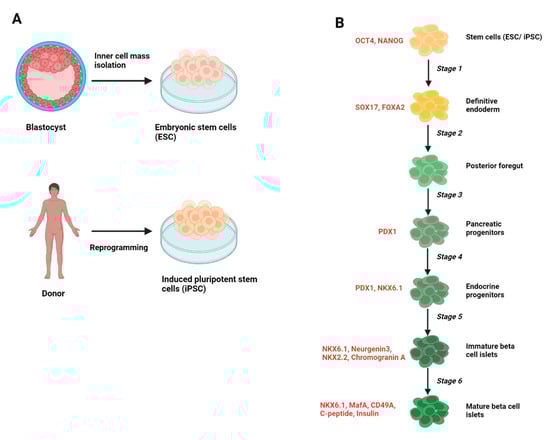 Schematic of the generation of stem cell-derived pancreatic beta cell islets. (A) Embryonic stem cells (ESC) are extracted from the inner cell mass of the blastocyst stage of the developing embryo and cultured under appropriate conditions to proliferate indefinitely. Induced pluripotent cells are generated by the direct reprogramming of somatic cells from a donor into pluripotent stem cells. (B) A general protocol outlining the stages of differentiation for the generation of pancreatic beta cell islets from stem cells (adapted from [149,154]). The resulting cells at each stage are labeled in black, and the quality control markers to track the efficiency (by flow cytometry or immunocytochemistry) of differentiation at each stage are labeled in red. This illustration was created with “BioRender.com (accessed on 17 April 2023)”.