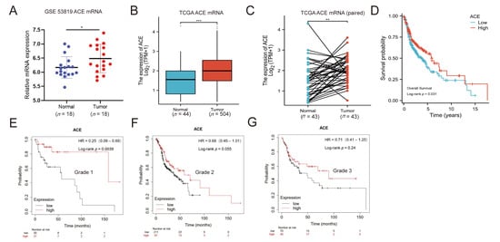 For Gene Expression Omnibus (GEO) datasets, mRNA expression data were downloaded and analyzed using HOME for Research (https://www.home-for-researchers.com). Analysis of the Cancer Genome Atlas (TCGA) dataset was performed using Xiantao Academic Online Tools (https://www.xiantao.love/products, accessed on 20 March 2023)). The correlation between overall survival (OS) and ACE expression was examined using Kaplan–Meier (K-M) survival plots according to the Kaplan–Meier Plotter database (http://kmplot.com, accessed on 4 April 2023).