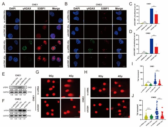 Ionizing radiation generates ROS in the exposed cells that attack DNA, including DNA single-strand breaks (SSBs) and double-strand breaks (DSBs) [4,23]. In DNA double- and single-strand breaks, phosphorylated histone H2AX (γH2AX) was detected and used as a surrogate marker for DNA lesions [24]. The colocalization of γH2AX and 53BP1 lesions represents the DSBs [25]. γH2AX foci and 53BP1 foci were detected by immunofluorescence (Figure 3A,B). As shown in Figure 3C,D, ACE knockdown significantly reduced the number of γH2AX and 53BP1 colocalization foci in the irradiated cells compared to controls.
