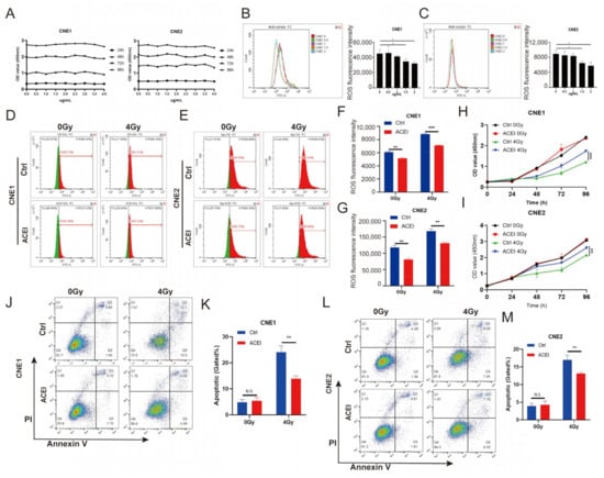 Previous studies have demonstrated that low ROS levels contribute to the radioresistance of cancer cells [7,8]. Consequently, we examined cell viability using the CCK8 assay to assess the effect of enalaprilat on NPC cells with IR. We found that enalaprilat did not affect the viability of CNE1 and CNE2 cells without IR, while it promoted the proliferation of NPC cells compared with the control group after treatment with IR at a dose of 4 Gy (Figure 4H,I). Apoptosis caused by IR is one of the most significant effects of tumor radiotherapy. To further investigate the role of enalaprilat in NPC cells, we used flow cytometry to detect cell apoptosis with or without IR (Figure 4J,L). As shown in Figure 4K,M, the rate of apoptosis did not significantly differ between the enalaprilat and control groups in the absence of IR; however, after treatment with IR, the rate of apoptosis was lower in the enalaprilat group than in the control group. These results reveal that the ACE inhibitor enalaprilat in combination with radiotherapy reduces the sensitivity of NPC cells to IR.
