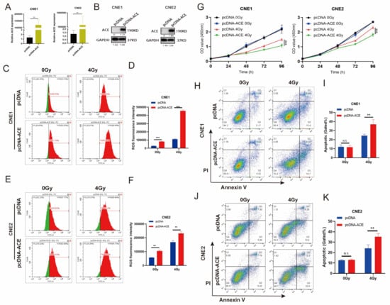 We previously observed that knockdown and inhibition of ACE can reduce ROS levels. Next, we overexpressed ACE in NPC cells. ACE was upregulated in the NPC cell lines CNE1 and CNE2 via transfection with pcDNA-ACE for overexpression. The overexpression of ACE mRNA and protein was confirmed by RT-qRCR and Western blotting, respectively (Figure 6A,B). We explored the effect of ACE overexpression on ROS levels. Flow cytometric analysis revealed that ACE overexpression increased intracellular ROS levels, and the ACE overexpression group had higher ROS levels than the no overexpression group in the irradiated cells (Figure 6C–F).
