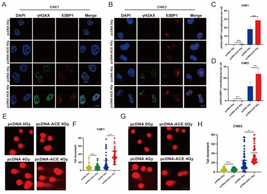 The colocalization of γH2AX and 53BP1 lesions represents the DSB [25]. γH2AX foci and 53BP1 foci were detected by immunofluorescence. ACE overexpression significantly increased the number of γH2AX and 53BP1 colocalization foci at 2 h post-irradiation compared to the control group (Figure 7A–D). As shown in Figure 7E–H, there were no significant differences in the average comet tail moment between the ACE overexpression group and the control group in the absence of IR. In contrast, the comet tail averages were significantly higher in the ACE overexpression group than in the control group at 2 h after 4 Gy with IR. These results demonstrate that ACE overexpression increases radiation-induced DNA damage.