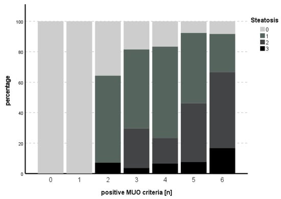 Number of positive MUO criteria in comparison to degree of steatosis. An increasing percentage of higher degrees of steatosis could be seen with increasing numbers of positive MUO criteria.