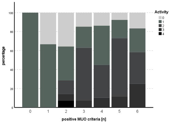 Number of positive MUO criteria in comparison to degree of activity. An increasing percentage of higher degrees of activity could be seen with increasing numbers of positive MUO criteria.