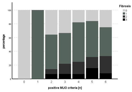 Number of positive MUO criteria in comparison to degree of fibrosis. An increasing percentage of higher degrees of fibrosis could be seen with increasing numbers of positive MUO criteria for up to five criteria, while this trend could not be established in the case of six positive MUO criteria.