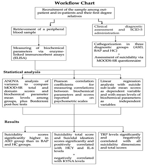 We performed an ANOVA analysis of variance in order to compare MOOD-SR total and domain scores, as well as biochemical parameter mean levels among groups, followed by Bonferroni post-hoc tests. Pearson correlation coefficients were calculated for measuring the correlations between biochemical parameters and scores reported on psychometric scales. In order to evaluate eventual biochemical parameters statistically predictive of suicidality in the sample, a linear regression analysis was performed with the suicide sub-scale mean scores as the dependent variable and with mean levels of biochemical parameters as independent variables. All the analyses were performed using SPSS, version 24 (IBM Corp., Armonk, NY, USA, 2016). For biochemical assays, calibration curves and the regression analyses were performed by means of GraphPad Prism (Version 7.0, San Diego, CA, USA). See Figure 1.
