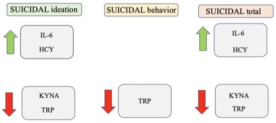 Regarding correlations with suicidality scores, we found that suicidality total score and suicidal ideation scores were significantly and positively correlated with both HCY and IL-6 levels, while they were negatively correlated with KYNA concentrations. Finally, TRP levels were significantly and negatively correlated with all suicidality dimensions and total scores (see Table 4 and Figure 2).