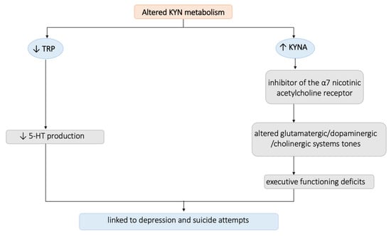 Numerous items of research have emphasized how the stimulation of the kynurenine (KYN) pathway of tryptophan (TRP) degradation, caused by neuroinflammation, may lead to an imbalance of the pathway metabolites, some of which may directly influence the manifestation of suicidal symptoms via the regulation of glutamate neurotransmission [50]. Moreover, the stimulation of the kynurenine (KYN) pathway leads to a reduction of TRP that ultimately causes a depletion of serotonin (5-HT) and melatonin [51], which is not only associated with an increase in aggressive and impulsive behaviors [52] but is also reported to be one of the major findings that differentiated biomarkers of suicide from those of other psychiatric disorders [53,54]. Additionally, kynurenic acid (KYNA)’s enhanced metabolism into the neurotoxic NMDA receptor agonist, quinolinic acid (QUIN), may lead to an overactivation of the glutamatergic system, which in turn affect brain-derived neurotrophic factor (BDNF) synthesis, with an eventual impact on neuroplasticity and cognition [55]. Regardless of the presence of co-occurring mood disorders, higher levels of QUIN were found in the cerebrospinal fluid (CSF) of patients who attempted suicide and those who had suicidal thoughts [51,56] and were also correlated to a higher score on the Suicide Intent Scale [51,57].