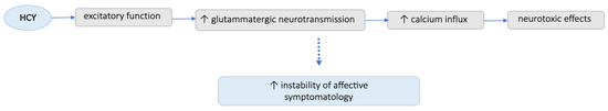 Lastly, our analysis reported a positive correlation between HCY and MOODS-SR depressive component as well as with suicidality scores. Our results are in line with previous research, which reported a substantial correlation between HCY and depression [170,171,172,173] but also identified HCY plasma levels as risk factors for the development of depression [174,175]. This evidence has been recently supported by a meta-analysis that included 46 observational studies [176]. In addition, HCY has been recently linked to suicide risks among patients with depression [177]; this result is in line with our data, which suggested a possible link between HCY levels and suicidality also among subjects in the autism spectrum. One of the possible mechanisms through which HCY levels may be involved in mood balance was hypothesized to lie in the excitatory function of HCY, which leads to an increase in the glutammatergic neurotransmission and, as a result, a calcium influx that has neurotoxic effects, ultimately leading to a greater instability of the affective symptomatology [178,179]. Moreover, a few community-based investigations highlighted a correlation between HCY concentrations and the severity and course of depression symptoms [180,181,182,183], also linking it with an increase in hostility and aggression and even by psychotic symptoms [184,185,186,187]. All this evidence seem to support the hypothesis arising from our results of the existence of a correlation between plasma levels of HCY and suicidality (See Figure 5).
