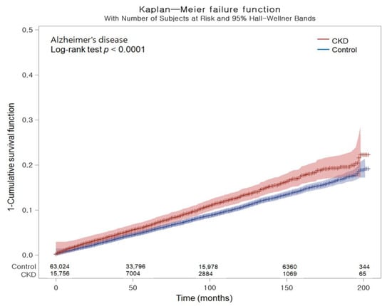 Table 2 shows the crude and adjusted hazard ratios (HRs) of CKD for incident AD. Overall, AD occurred in 1050 (6.66%) patients among the 15,756 patients with CKD and 4053 (6.43%) of the 63,024 control cohort. With their follow-up durations (66,403 and 326,315 person-years, respectively), the incidence rate of AD (15.80 per 1000 person-years) was higher in the CKD group than in the control group (12.40 per 1000 person-years). After adjusting for demographic factors and medical comorbidities, Cox regression analysis documented that individuals with CKD had a greater probability of developing AD compared to the control group (HR, 1.14; 95% confidence intervals (CIs), 1.08–1.20; p < 0.001). Kaplan–Meier analysis and log-rank test indicated a greater likelihood of developing AD among individuals with CKD in comparison with the control group throughout the 16-year follow-up period (p < 0.0001; Figure 1).