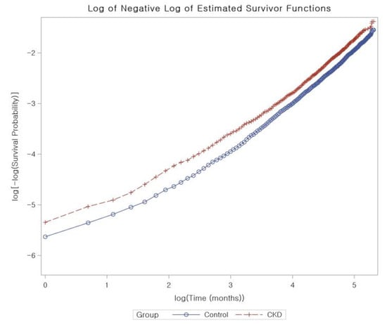 The proportional hazard assumptions for chronic kidney disease using log-minus-log plots. The analysis does not identify any violations of these assumptions, indicating that our results are reliable and accurate.