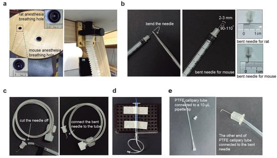 Graphic schemes for the construction of CSF collection and injection tools. (a) Custom-made surgical table containing two breathable holes of different sizes for hosting mice and rats, respectively. The two holes are connected to the anesthesia machine with gas tubes. (b) The preparation process of a bent needle consists of using forceps to hold the needle at a certain distance and then applying force to bend it. We recommend bending the needle at an angle of 90–110°. The tip length is 2–3 mm and 4–5 mm for mice and rats, respectively. (c) Preparation process of surgical needle set by cutting off the needle from the intravenous infusion needle, then connecting the bent needle to the soft tube. (d) An overview of the surgical tools for CSF collection by connecting custom-made surgical needle sets to a needleless 1-mL syringe. (e) Graphical scheme for the injection tools by connecting the bent needle with the PTFE capillary tube. Once the bent needle end is connected, connect the other end of the PTFE tube to a 10-µL pipette tip and a pipette.