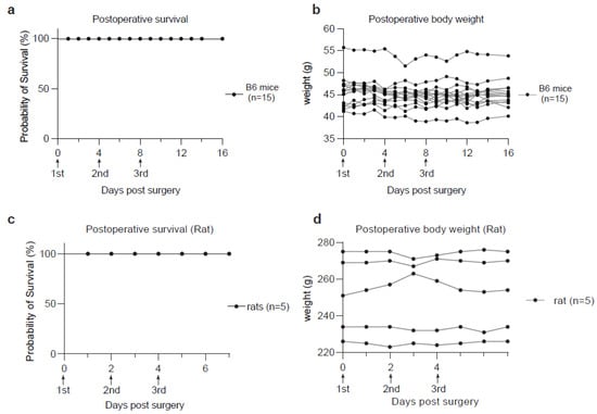 Animal survival and body weight monitoring after CSF collection. (a) Kaplan-Meier curve showing the survival rate of postoperative B6 mice (n = 15). (b) Curves showing the time-course monitoring of body weights in the postoperative B6 mice used in (a). (c) Kaplan-Meier curve showing the survival rate of postoperative rats (n = 5). (d) Curves showing the time-course monitoring of body weights in the postoperative rats used in (c).