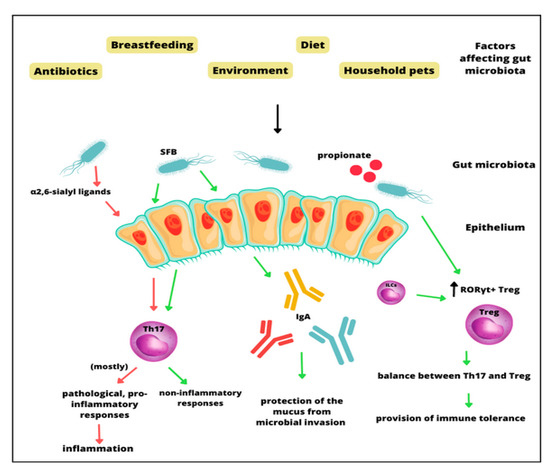 Understanding interactions between intestinal microbiota, host, and asthma pathophysiology is crucial to determining immunological mechanisms. Interactions between host immune cells and the gut microbiota are important for the development of the immune system and homeostasis in the respiratory tract. Microbial interaction with the immune system is crucial in maintaining proper immune responses which prevent the development of both infectious and non-communicable diseases. During research conducted on germ-free mice, it was revealed that the gut adaptive immune system is suppressed in these animals. What is more, the introduction of commensal bacteria to their microbiota could induce the development of mucosal CD4+ T cells and cytotoxic CD8+ T cells [37]. T helper 17 cells (Th17), which play an important role in host protection as well as in inflammatory responses, can support pathogenic effector T cells in extra-intestinal diseases. Specific microbes, such as segmented filamentous bacteria (SFB) and other commensal species, can induce such responses. Additionally, Th17 responses can also be influenced by the gut microbiota [38]. The microbiome-dependent Th17 inflammation is regulated by α2,6-sialyl ligands; α2,6-sialyltransferase deficiency can induce mucosal Th17 responses [39]. Actinobacterium Eggerthella lenta can also promote pathological Th17 cells through the cardiac glycoside reductase 2 enzyme. Other immune cells whose activity is modulated by the gut microbiota are Treg cells—exposure to microorganisms as well as diet can induce Treg production [38]. This process happens via several mechanisms. Microbiota-specific RORγt+ Treg cells can be selected by innate lymphoid cells, which prevents the expansion of Th17 cells and causes intestinal immune tolerance [40]. On the other hand, some species such as Helicobacter spp. and Akkermansia muciniphila can induce RORγt+ Treg cell-mediated immune responses. A microbial metabolite, propionate, in lowered levels might cause pathological differentiation of Th17/Treg cells [41]. Another part of the immune system that gut microbiota contributes to is IgA production. It has been documented that germ-free animals have smaller Peyer’s patches and that intestinal IgA levels are severely induced in these organisms [42]. It is also suggested that specific microbes can induce intestinal IgA more significantly; for example, colonization with segmented filamentous bacteria (SFB)–mouse symbiotic organisms causes an increase in intestinal IgA production. What is more, mice with intestinal SFB colonization have higher intestinal IgA levels than those colonized with Clostridium (Figure 1).