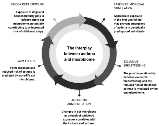 Initially proposed to elucidate the connection between microorganism exposure, decreased atopy, and allergic diseases risk, the hygiene hypothesis [52] proved insufficient in explaining the host–microorganism interplay in asthma due to its disregard of respiratory viral infections and the role of non-pathogenic microbes [53]. Subsequently, the hygiene hypothesis was adjusted, and it evolved into the “old friends’ hypothesis” [54], which highlights the role of immune response modulation after birth by specific commensal microorganisms from the microbiota in protecting the host from hypersensitivity to common antigens.