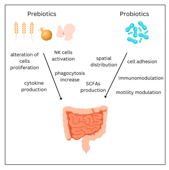 Probiotics are live microorganisms administered to provide a health benefit when consumed in adequate amounts [96]. They are available in the form of dietary supplements or foods and comprise Saccharomyces boulardii yeast or lactic acid bacteria such as Lactobacillus and Bifidobacterium [97]. They can be found in both single-strain or multi-strain formulations. In some studies, probiotic mixtures appear to demonstrate higher effectiveness compared with single strains [98,99]. However, a recent 2021 meta-analysis concluded that their efficacy is similar [100]. Probiotics are used in treating antibiotic-associated diarrhea, gastrointestinal disorders, respiratory infections, bacterial vaginosis, and atopic eczema. Research efforts have been put into investigating the efficacy of probiotics in a number of various medical conditions, such as elevated cholesterol levels, cystic fibrosis hepatic encephalopathy, and diabetes [101,102]. The effects of probiotics are achievable through several different mechanisms that include cell adhesion, mucin production, pH modulation, and motility improvement [103]. Their efficacy is also connected with their spatial distribution in the gut lumen and the production of H2O2, SCFAs, and B group vitamins [104,105,106]. A very promising area is the anticancer impact of probiotics, which includes their influence on the immune system, cytokine production, and phagocytosis [107]. Numerous studies have examined the beneficial effect of probiotics, but the results are ambiguous due to differences in the strains and doses of probiotics used, the populations studied, and the study design [108]. Some studies have shown the prophylactic effect of probiotic supplementation [109,110]. However, the findings of most meta-analyses do not support it. The meta-analyses from 2013 and 2015 investigating the role of prenatal or early-life probiotic supplementation showed a reduction in the risk of atopic sensitization and eczema, but not a reduction in the risk of asthma or wheezing [95,111]. A 2020 meta-analysis showed similar results, apart from the subgroup of infants with atopic disease, in which the probiotics significantly reduced the incidence of wheezing [112]. A systematic review of probiotic supplementation in children with asthma found an association with fewer exacerbations, lower IL-4 levels, and higher interferon-γ levels. Nevertheless, there were no differences in asthma control tests, respiratory symptoms, or parameters of lung function [113]. Based on current knowledge, probiotic administration to reduce wheezing development is not recommended [114]. However, some most recent studies underline the efficacy of probiotics, especially highlighting the need to investigate specific probiotic strains. In a study by Ciprandi et al., the mixture of two strains (Ligilactobacillus salivarius LS01 and Bifidobacterium breve B632) significantly prevented wheezing and asthmatic exacerbations in children [115]. A study by Sangkanjanavanich et al. showed the effectiveness of Bifidobacterium infantis in improving lung function and control of uncontrolled asthma [116]. What is more, a 2022 meta-analysis indicates that probiotic intake improves quality of life and reduces symptoms of allergic asthma and allergic rhinitis [117]. Extended follow-up of ongoing trials, along with additional clinical and basic research, is necessary to determine the value of probiotics for asthma in children. Genetics, epigenetics, mechanisms of action, and personal responsiveness to specific strains should be the topic of interest in future studies [115]. The mechanisms of action of probiotics and prebiotics are summarized in Figure 4.