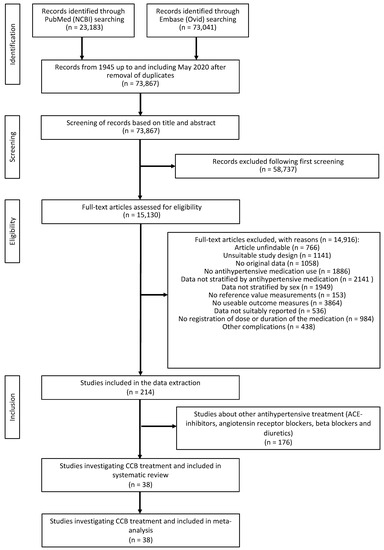 The literature search in PubMed and Embase provided a total of 73,867 unique records after removing duplicates (Figure 1). During the first screening, 58,737 articles were excluded resulting in 15,130 articles that were assessed based on the full text. Of those articles, 14,916 met at least one exclusion criterion and were excluded. For 766 articles (5%), it was not possible to find or access the full text at the university library or online. In total, 1141 articles (8%) had an unsuitable study design. This criterion was met when, for example, only measurements were taken during exercise, or SBP and DBP were measured using an arterial catheter. In total, 1058 articles (7%) did not report original research data; these articles were reviews, for example. In 1886 articles (13%), no antihypertensives were given to the patients participating. In 2141 articles (14%), antihypertensives were given, but treatment results were not stratified by those. In total, 1949 articles (13%) were excluded because treatment results were not stratified by sex. In total, 153 articles (1%) did not have reference measurements. In total, 3864 articles (26%) did not contain any measurements of interest. In 536 articles (4%), data were not suitably reported. In 984 articles (6%), no information was provided regarding either dose, duration, or both. Finally, there were 438 articles (3%) excluded because of other complications. At the end of the selection procedure, a total of 214 articles were classified suitable for inclusion (Figure 1). Eventually, in 38 of those articles, CCB were the provided treatment.