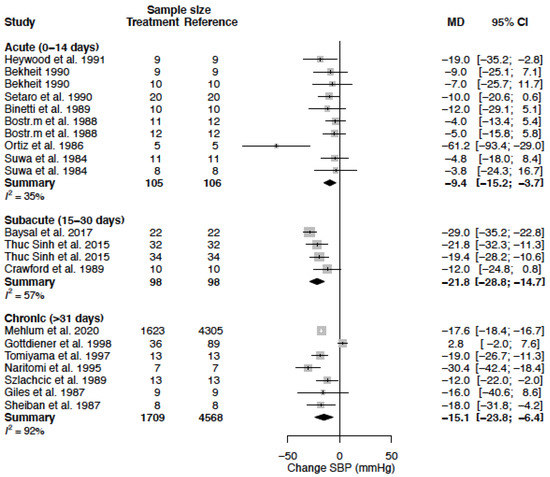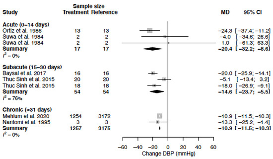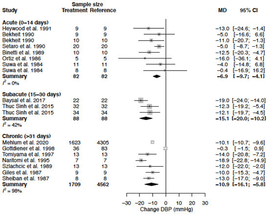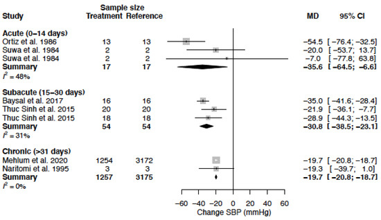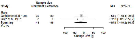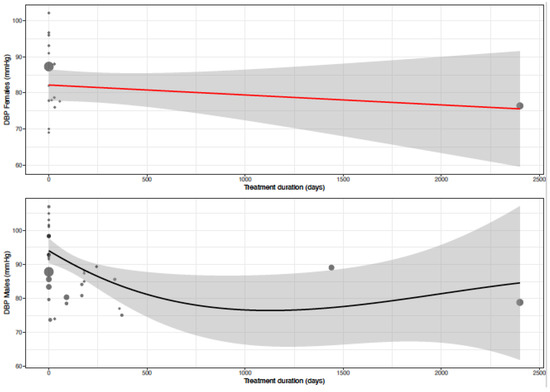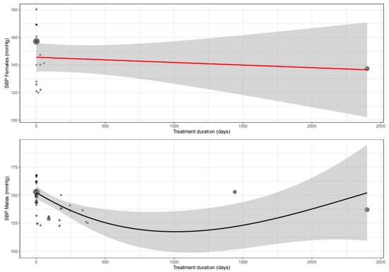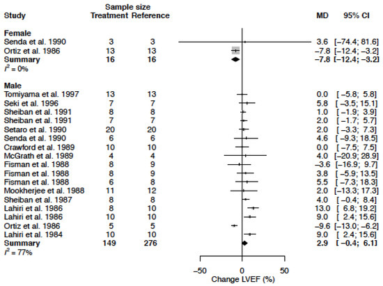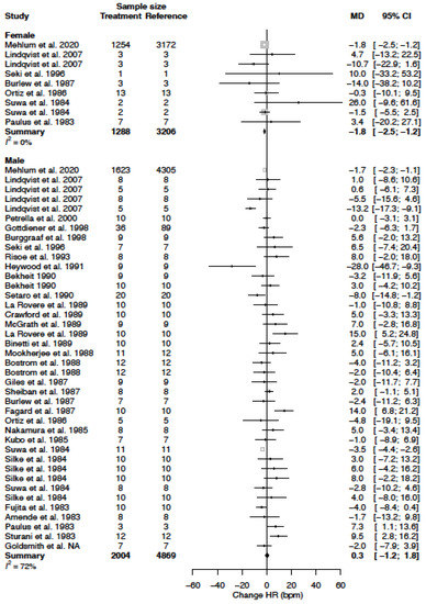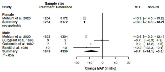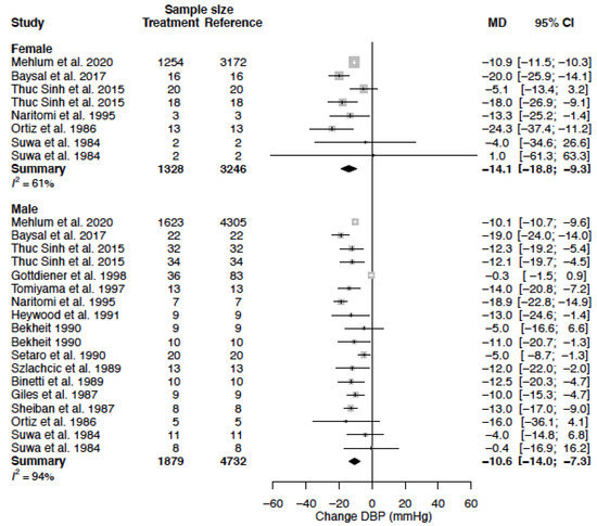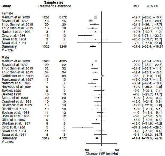 The mean difference and relative change from baseline in percentage for systolic blood pressure (SBP) are reported in Table 4 and Figure 2. The mean SBP in the female population was 162.6 mmHg (95% CI 156.9; 168.2) and the mean SBP in the male population was 146.0 mmHg (95% CI 140.1; 151.8) (p < 0.0001). In females as compared to males, SBP decreased by −27.6 mmHg (95% CI −36.4; −18.8) (%change −17.1 (95% CI −22.5; −11.6)) versus a decrease of 14.4 mmHg (95% CI −19.0; −9.9) (%change, −9.8 (95% CI −12.9; −6.7)). This change was statistically significant between sexes (p-value = 0.009). Heterogeneity was moderate to high in female (I2 = 77%) and high in male (I2 = 83%) data. Heterogeneity in SBP response was significantly affected by the CCB diltiazem, delineated as a clinical source of heterogeneity (Table 5).