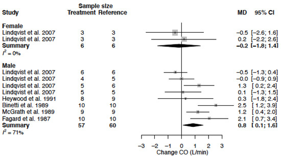 If an SE or 95% CI was reported in the article, the SD was calculated according to the Cochrane Handbook for Systematic Review of Interventions [17]. Changes in the cardiovascular and haemodynamic variables from baseline were separately analyzed for females and males using a random-effects model as described by DerSimonian and Laird [18]. Because the included studies had some variation in study population and design, the random-effects model was chosen to account for this interstudy variation [18]. Egger’s regression test for funnel plot asymmetry was conducted to test for publication bias for each cardiovascular variable [19]. The primary outcome was the mean difference and 95% CI between baseline and follow-up of the intervention, visualized in forest plots. The relative change from baseline in percentage including 95% CI was also calculated and reported in parentheses behind the mean difference in the text. The I2 statistic, the ratio between heterogeneity and variability, was calculated as a measure of consistency and expressed as percentage in the forest plots. I2 is able to distinguish heterogeneity in data from solely sampling variance [17]. Interpretation of I2 was based on the guidelines in the Cochrane Handbook for Systematic Review of Interventions [17]. Sources of clinical heterogeneity (CCB type, treatment duration, and dosage) and methodological heterogeneity (quality of study) were investigated by meta-regression analyses using a mixed-effects model [17]. For the meta-analyses and meta-regression analyses, the meta package in the statistical program R version 4.0.3. was used [20,21].