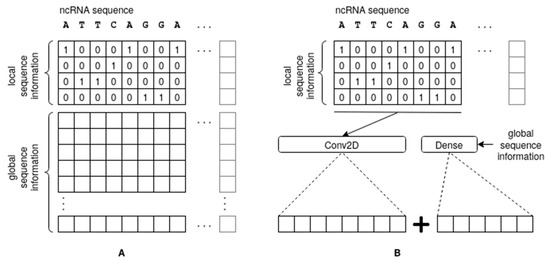 The first module is used to process the local sequence information and maps the main bases A, C, T, and G using 4-bit one-hot encoding (see Figure 2A); other symbols in the dataset have been encoded as a zero vector for simplicity, as they were very rare. The resulting 2D matrix is processed via a 2D CNN, followed by a series of 1-dimensional CNNs. The use of simple one-hot encoding (a k-mer with k = 1) does not add complexity to the pattern, leaving the responsibility of finding the best combination of features to the CNN. Numerous more sophisticated encoding schemes have been proposed in the literature in an attempt to capture the structure of ncRNA, such as space-filling curves [33], which compress the sequence into a 2D or 3D array following specific schemes. Such arbitrary encoding schemes attempt to artificially introduce spatial proximity into the feature space in a way that has no relevant biological meaning. Our approach is supported by experimental evidence demonstrating superior performance of k-mer encoding with k = 1 [21].