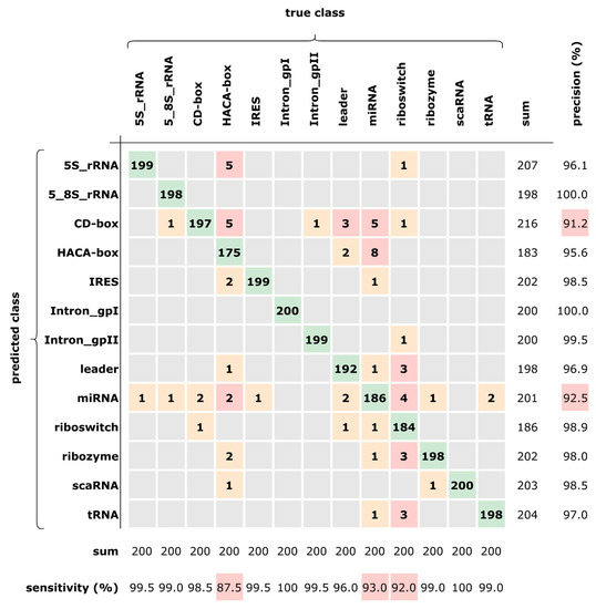 The confusion matrix in Figure 5 shows the predictions over the test dataset (2600 sequences) and has been computed so as to evaluate the per-class accuracy. The best accuracy (≥99%) has been obtained in seven classes, whereas the three classes CD-box, miRNA, and HACA-box resulted in being more difficult to predict (lower sensitivity). This could be explained by the fact that HACA-box and CD-box belong to the same superclass “small nucleolar RNAs” (snoRNAs) and hence share many similarities. Moreover, miRNA resulted in being particularly hard to predict, being often confused with other classes having the same percentages (but not with Intron_gpI, Intron_gpII, and scaRNA).