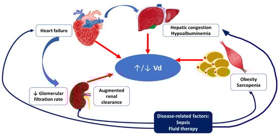 The list of the main factors affecting Vd and clearance in the elderly with severe infections and their interrelationships. Severe infections may worsen heart failure and hepatic congestion, contribute to sarcopenia progression and fat redistribution. Exacerbation of heart failure leads to the decreased renal function, while septic changes may result in the augmented renal clearance. In critically ill patients Vd of hydrophilic agents may be increased with hemodynamic insufficiency development, excessive permeability of capillaries, and infusion therapy, while Vd of lipophilic agents may be decreased due to the decrease of fat tissue mass. These changes are different from those observed in a healthy elderly patient (typically decreased Vd of hydrophilic agents and increased Vd of lipophilic agents).