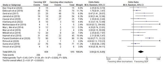 The statistical analysis displayed an odds ratio of 3.59 (2.13, 6.05) for events favoring SDF compared to other biomarkers/control groups in the selected studies as represented in Figure 3. The forest plot visualized the risk difference for each study included in the meta-analysis, which represented the difference in the proportion of events favoring SDF between the SDF and control groups. The analysis found heterogeneity between studies, with a Tau2 of 0.49 and a Chi2 of 31.64 with 14 degrees of freedom (p = 0.005) and an I2 of 56%. The significant p-value for Chi2 indicates that this heterogeneity was unlikely to have occurred by chance. The Z-statistic for the overall effect was 4.81 (p < 0.00001), indicating that the odds of events favoring SDF were significantly higher in the SDF group compared to the control group. In summary, the statistical analysis suggests that SDF is associated with a higher odd of events favoring SDF compared to other biomarkers/control groups, with some degree of heterogeneity between studies. Further research may be needed to better understand this variation.