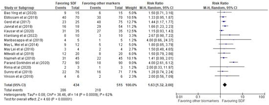 The risk ratio of 1.63 (1.32, 2.00) is displayed in Figure 4 for events favoring SDF compared to other biomarkers/control groups in the selected studies. The forest plot displayed the risk difference for each study included in the meta-analysis, representing the difference in the proportion of events favoring SDF between the SDF and control groups. The analysis found heterogeneity between studies, with a Tau2 of 0.08 and a Chi2 of 36.46 with 14 degrees of freedom (p = 0.0009) and an I2 of 62%. The Z-statistic for the overall effect was 4.60 (p < 0.00001), indicating that the odds of events favoring SDF were significantly higher in the SDF group compared to the control group.