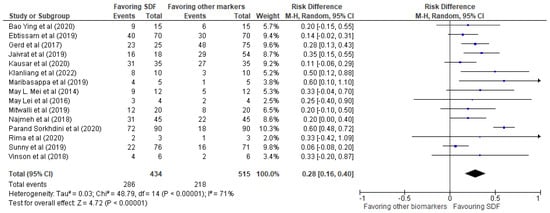 The representation of the risk difference in the form of a forest plot in Figure 5 displayed the individual studies included in the meta-analysis, the value of which was found to be 0.28 (0.16, 0.40). The results showed some heterogeneity, with a tau-squared value of 0.03 and a Chi2 value of 48.79 with 14 degrees of freedom, resulting in a p-value of less than 0.00001. This indicated significant heterogeneity in the results. The overall effect was statistically significant, with a Z-score of 4.72 and a p-value of less than 0.00001. The analysis indicated that SDF had a significant risk difference compared to other biomarkers/control groups, and while some heterogeneity was observed, the overall effect was statistically significant.
