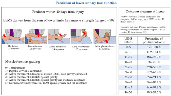 A study based on a large and prospectively-collected dataset derived from the European Multicenter Study about Spinal Cord Injury (EMSCI) identified two models to predict the recovery of lower urinary tract function one year after traumatic SCI [41]. In this study, a positive outcome at one year was defined as urinary continence (assessed by bladder diary) and complete bladder emptying (i.e., post-void residual <100 mL assessed by ultrasound or “in-out” catheterization). Lower urinary tract function and management at one year were evaluated through SCIM version II or III item 6 (sphincter management—bladder), where a score of 15 indicates a positive outcome [15,42]. The two models relied on predictors recorded within 40 days from traumatic SCI and calculated the probability of positive lower urinary tract outcome at one year, expressed in percentage. The full model relied on three clinical predictors: the LEMS of ISNCSCI, the highest score between the right and left side of the light-touch sensation in the S3 dermatome of ISNCSCI and SCIM subscale respiration, and a sphincter management score (investigating the independence in breathing, lower urinary tract, bowel, and toilet management). The simplified model relies on a single predictor, the LEMS of ISNCSCI. Figure 1 illustrates the predictor, the outcome measure, and the expected probabilities of recovery of lower urinary tract function calculated with the simplified model. The algorithm of both models is included in the original publication [41]. Both full and simplified models confirmed an excellent performance in an external validation [41]. Moreover, the validity of the simplified model based on LEMS only was confirmed by an independent study on a large dataset of patients included in the United States National Spinal Cord Injury Database [43]. The two prediction models of lower urinary tract outcome demonstrated a high performance also in a cohort of EMSCI patients with ischemic SCI, thus extending the validity of these tools also to patients with ischemic lesions [44].