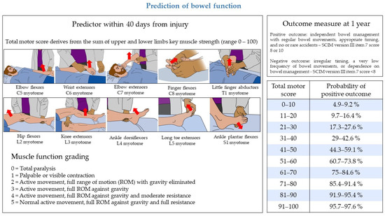 Prediction model of bowel function and expected probability of positive outcome one year after traumatic SCI. The model is based on a single predictor, the total motor score of the International Standards for Neurological Classification of Spinal Cord Injury (ISNCSCI). One-year bowel outcome is evaluated through a dichotomization of the Spinal Cord Independence Measure (SCIM) item 7 score. The table reports the expected probability of a positive outcome at 1 year based on the total motor score collected within 40 days from injury. Images refer to the muscle strength evaluation of grade 3. Images modified from the Motor Exam Guide, American Spinal Injury Association: International Standards for Neurological Classification of Spinal Cord Injury, revised 2019, Richmond, VA, with permission of the American Spinal Injury Association.