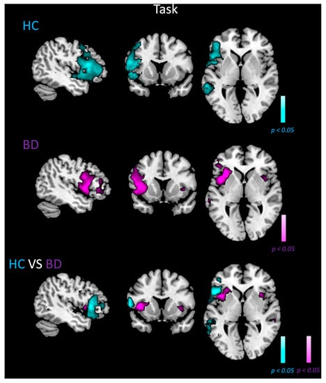 - Curtis, V.A.; Thompson, J.M.; Seal, M.L.; Monks, P.J.; Lloyd, A.J.; Harrison, L.; Brammer, M.J.; Williams, S.C.R.; Murray, R.M.; Young, A.H.; et al. The nature of abnormal language processing in euthymic bipolar I disorder: Evidence for a relationship between task demand and prefrontal function. Bipolar Disord. 2007, 9, 358–369. [Google Scholar] [CrossRef] [PubMed]