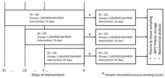 Adult (4–5 months old) male Wistar rats were obtained from the Laboratory of Animal Resources, Paulista University (UNIP), São Paulo, Brazil, and were randomly distributed in a four-arm parallel group experiment [15]. Three sets of 24 animals each were initially used in experimental treatments, from which 21 samples were collected after 7 days of treatment; 23 samples were collected after the 15-day intervention; and 22 samples were collected after the 31-day intervention. The animals were kept under controlled light conditions (12 h light-dark cycle) and water and standard laboratory animal feed (52% carbohydrate, 21% protein, and 4% lipid; Nuvilab CR1, Nuvital, Curitiba, PR, Brazil) were provided ad libitum during the experimental period. All animal procedures were performed in accordance with the guidelines of the Committee on Care and Use of Laboratory Animal Resources and Brazilian Institutional Ethics Committee, Paulista University (protocol number 182/13, CEUA/ICS/UNIP).