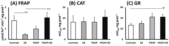 Figure 3 illustrates the antioxidant activities in the brainstem after 7 days of EB, PROP and EB + PROP combined treatments. Although catalase activities were unaltered in all groups (compared to control, Figure 3B), significant changes were observed in FRAP and GR activities (Figure 3A,C, respectively). EB treatment drastically dropped FRAP activity in the nervous tissue after 7 days (−75%, Figure 3A). Interestingly, PROP administration showed a tendency of diminished FRAP activities in the brainstem, but statistically this was not not different (p = 0.058; Figure 3A). Undoubtedly, combined EB + PROP treatment reverted the lower FRAP activities found in single EB-treated samples back to control levels (Figure 3A). Regarding GR activities, EB treatment did not affect the enzyme activity in the CNS, although 59% higher GR activity was measured in the EB + PROP group, compared to control (Figure 3C). Single PROP treatment only showed tendencies of higher GR activity compared to control (p = 0.054, Figure 3C).