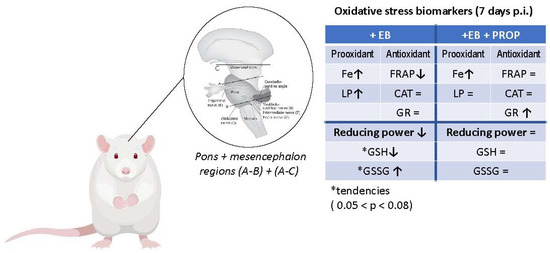 The choice of the appropriate sampling method is known to be crucial for accurate haematological and clinico-biochemical measurements [17]. Blood samples were collected in EDTA-containing Vacutainer® flasks for plasma isolation (after centrifugation for 5 min, at 4× g, RT). Heparin-coated tubes were avoided here, as the study aimed to measure indices involving iron metabolism or iron-chelating capacities. For biochemical analysis in the nervous tissue, all rats from experimental groups were euthanized and whole brains were collected at each of the sampling periods: 7, 15, and 31 days post-EB injection (p.i.). Pons and mesencephalon portions of the brainstem were cautiously removed, immediately frozen in liquid nitrogen, and stored in a −80 °C freezer for further analyses. Figure 2 sketches the experimental design of our study.