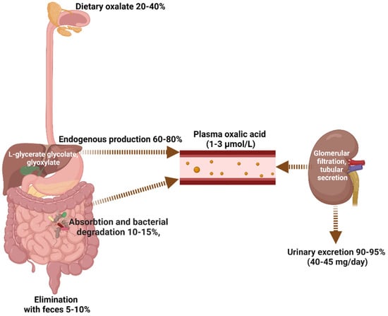 Under physiological conditions, oxalate homeostasis is maintained through a complex interplay between dietary oxalate intake, oxalate metabolism and absorption in the gastrointestinal tract, and oxalate excretion through the kidneys and intestine (Figure 1) [,,,].
