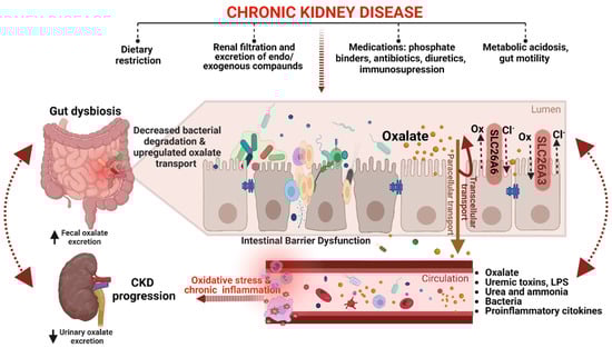The presence of chronic inflammation caused by dysbiosis further exacerbates the decline in GFR, leading to reduced renal clearance of oxalate and the development of hyperoxalemia. In response to hyperoxalemia, enteric oxalate excretion becomes an important compensatory mechanism for maintaining oxalate homeostasis [,,]. It has been hypothesized that in CKD, the intestine may adapt and increase the secretion of oxalate into the intestinal lumen by upregulating the expression of oxalate transporters [,]. A recent study on animal models of CKD found that the SLC26A6 oxalate transporter, which plays a key role in restricting net absorption by back-secreting oxalate into the lumen, is upregulated not only in the small intestine but also in the colon, resulting in increased oxalate removal through fecal excretion []. Controversially, reduced fecal oxalate excretion and increased POx concentration were observed in SLC26A6 gene-deficient mice, suggesting that enteric oxalate secretion via SLC26A6 plays a vital role in defending against hyperoxalemia in CKD []. It is essential to note that this is the only study on intestinal SLC26A6 expression in CKD models, and much work remains to be done to improve our understanding of the impact of the gut-kidney axis on oxalate homeostasis in CKD. Although a definitive understanding of this complex relationship remains incomplete, Figure 3 provides a schematic summary of current knowledge on the gut–kidney axis in CKD oxalate homeostasis.