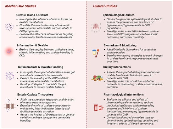 Although considerable progress has been made in understanding oxalate’s involvement in CKD, there is still a significant knowledge gap in this area, highlighting the need for further research. Furthermore, there is a lack of awareness and understanding among healthcare providers regarding the importance of managing the oxalate burden in CKD. Enhancing awareness and understanding of the underlying mechanisms of oxalate imbalance in CKD is crucial for identifying at-risk patients, enabling early diagnosis and intervention, and ultimately improving clinical outcomes. To enhance our comprehension of oxalate homeostasis in CKD, a number of crucial research avenues should be pursued (Figure 4).