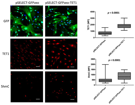 Increased expression of TET1 and amount of 5hmC in primary fibroblasts stably transfected with the pSELECT-GFPzeo-TET1 vector as compared to primary fibroblasts stably transfected with the pSELECT-GFPzeo control vector. Immunofluorescence: GFP—green fluorescent protein, green. TET1—predominantly nuclear localization of TET1, red. 5hmC—nuclear localization of 5-hydroxymethylcytosine, red. Nuclei stained with Hoechst 33342, blue. MFI—mean fluorescence intensity. Scale bar—50 µm.