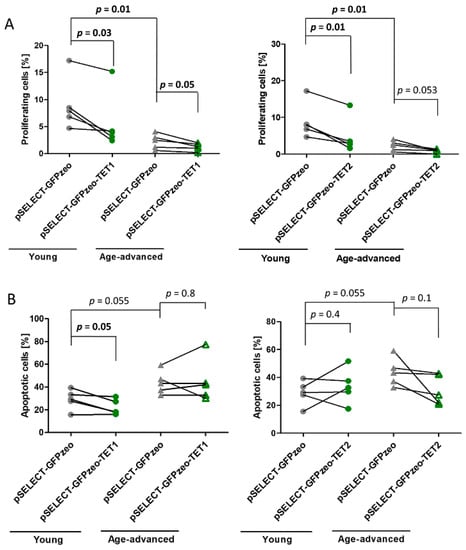 Effects of TET1 and TET2 overexpression on the proliferation and apoptosis of fibroblasts obtained from young (n = 5) and age-advanced (n = 5) study participants. (A). Changes in the percentage of proliferating fibroblasts. (B). Changes in the percentage of apoptotic fibroblasts. Statistical analysis was performed using the Mann-Whitney U test (young pSELECT-GFPzeo vs. age-advanced pSELECT-GFPzeo) and Wilcoxon matched-pairs signed rank test (pSELECT-GFPzeo vs. pSELECT-GFPzeo-TET1 or pSELECT-GFPzeo-TET2).